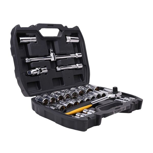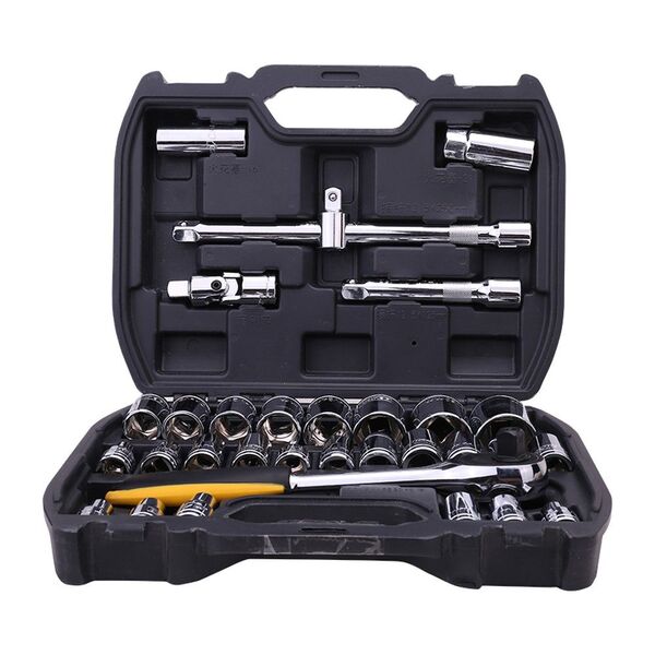 - Набор из 32 элементов (в том числе - гнездовой ключ, удлинители, 25 торцевых головок), кейс-органайзер