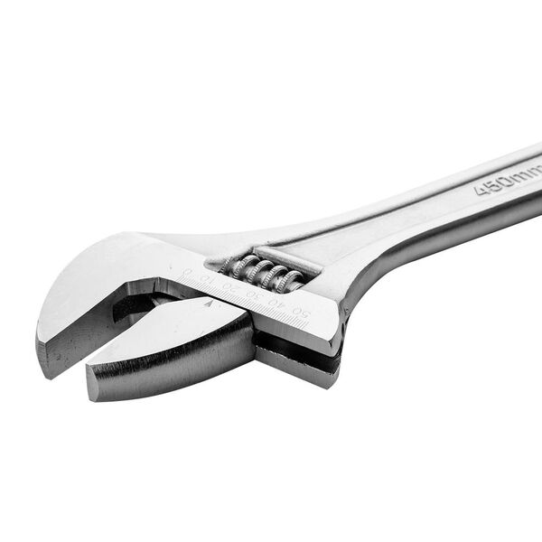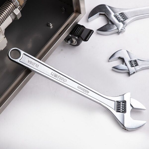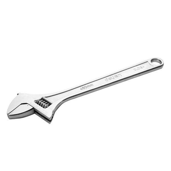 Разводной ключ Deli DL018A 18"; Длина: 450 мм. Регулируемый размер зажима: 0-55 мм. Кованая специальная инструментальная сталь. Хромированная отделка.