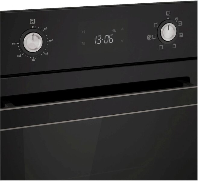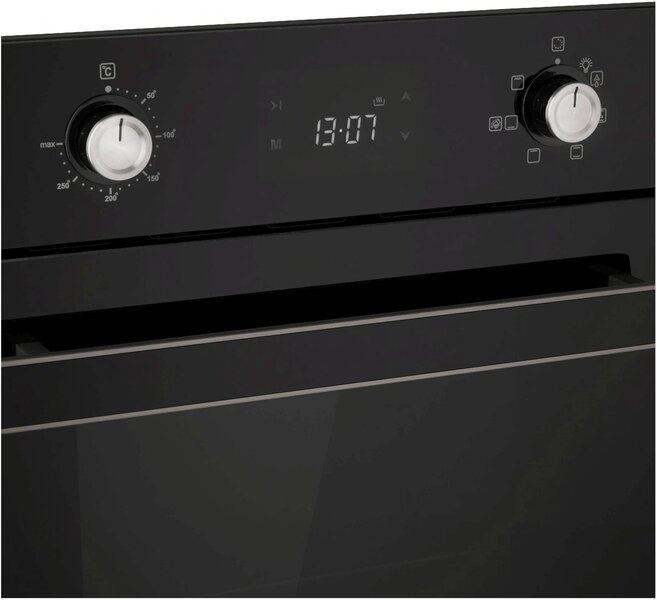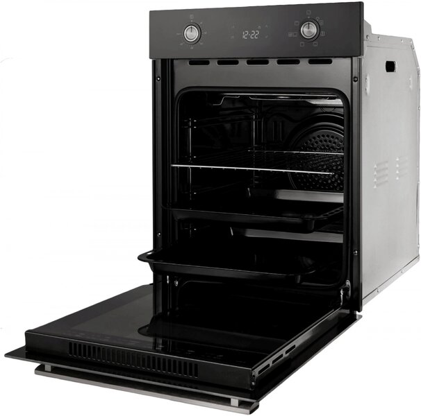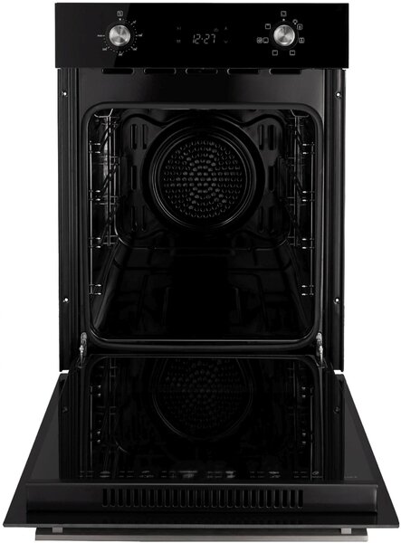 Духовой шкаф электрический духовой шкаф встраиваемый узкий, 45 см, 7 режимов, объем духовки 52л, утапливаемые переключатели, дисплей Snow White, фронтальная поверхность Full Black, хромированные боковые решетки, панель управления - черное стекло, универсальный противень, дополнительный противень, решетка-гриль, двойное стекло дверцы, максимальная температура приготовления 300 оС, регулировка яркости дисплея и громкости звукового сигнала, защитное отключение при перегреве, охлаждающий вентилятор, электронны