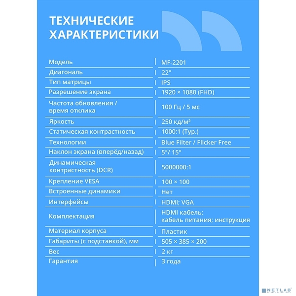 Монитор CBR LCD Монитор 22" MF-2201 VA, 1920x1080, 75Гц, черный, кабель HDMI 1.5м в комплекте [LCD-MF2201-OPC] купить в интернет-магазине TPShop.Ru. Наличный и безналичный расчет, розничные и оптовые продажи. Самовывоз, доставка по Москве и МО, отправка во все регионы России.