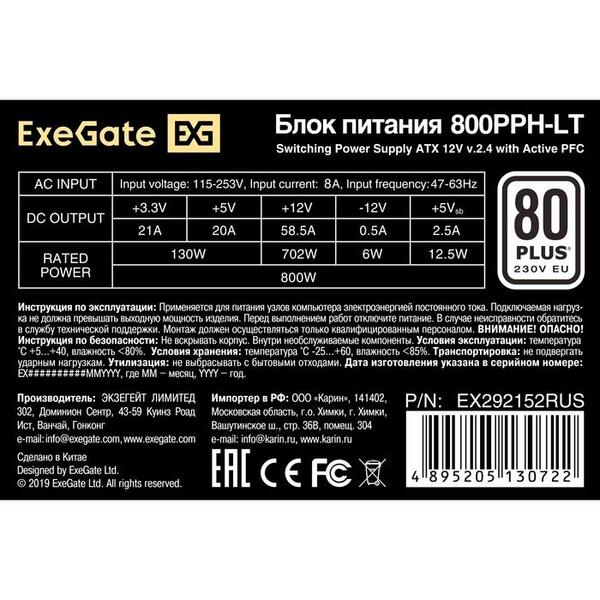 Блок питания Exegate EX292152RUS-S Блок питания 800W ExeGate 80 PLUS® 800PPH-LT (ATX, APFC, SC, КПД 82% (80 PLUS), 12cm fan, 24pin, (4+4)pin, PCIe, 5xSATA, 3xIDE, кабель 220V с защитой от выдергивания, black, Colo купить в интернет-магазине TPShop.Ru. Наличный и безналичный расчет, розничные и оптовые продажи. Самовывоз, доставка по Москве и МО, отправка во все регионы России.