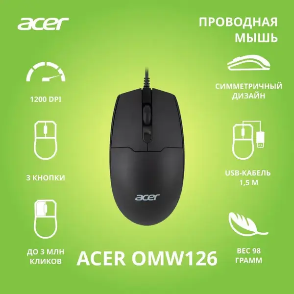 Мышь Acer OMW126 черный оптическая (1000dpi) USB (3but) купить в интернет-магазине TPShop.Ru. Наличный и безналичный расчет, розничные и оптовые продажи. Самовывоз, доставка по Москве и МО, отправка во все регионы России.