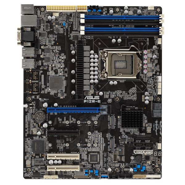 P12R-E ATX, LGA 1200, 4x DDR4 DIMM (to 128GB ECC UDIMM), 6x USB 3.0 (4 rear), 8x SATA (4 in MiniSAS HD), 1x PCIE x16 / x8, 1x PCIE x8, 2x PCIE x8 (link x4), 2xM.2 22110, LAN 2x 1Gb, Video AST2600, IPMI