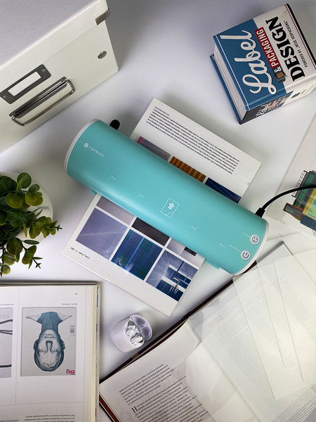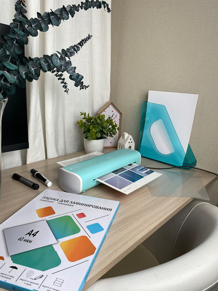Ламинатор ГЕЛЕОС ЛМ A4 Модерн светло-синий+белый, А4, 2х150 (пленка 75-150 мкм), 300 мм/мин, 2 вала, пласт. корпус, мах толщина 0,6 мм, разжим валов