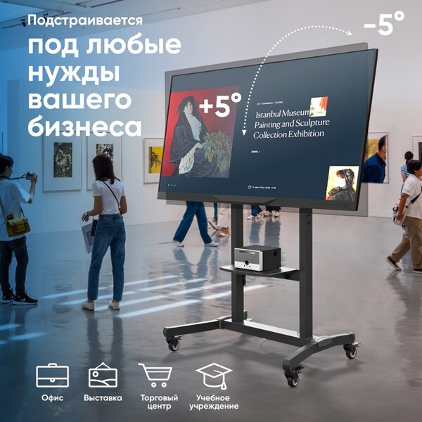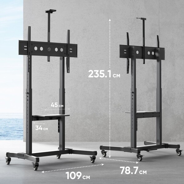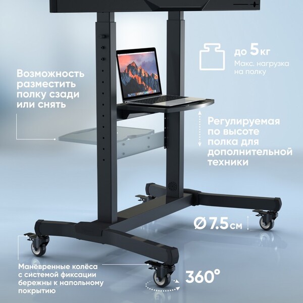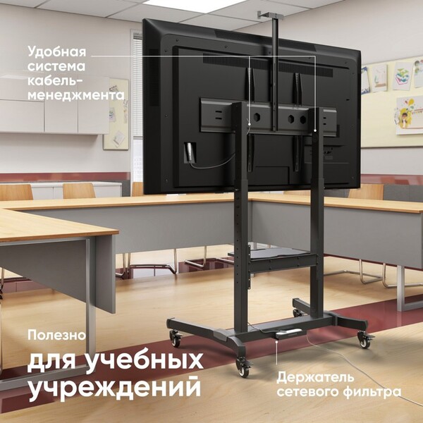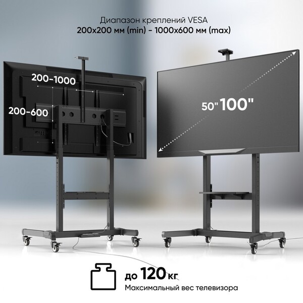 Мобильная стойка ONKRON на 1 ТВ/ 50-100" от 200х200 до 1000х600, макс нагр 120кг, 1 полка для AV, полка для камеры, кабель-канал, высота 1234-1685мм, черный купить в интернет-магазине TPShop.Ru. Наличный и безналичный расчет, розничные и оптовые продажи. Самовывоз, доставка по Москве и МО, отправка во все регионы России.