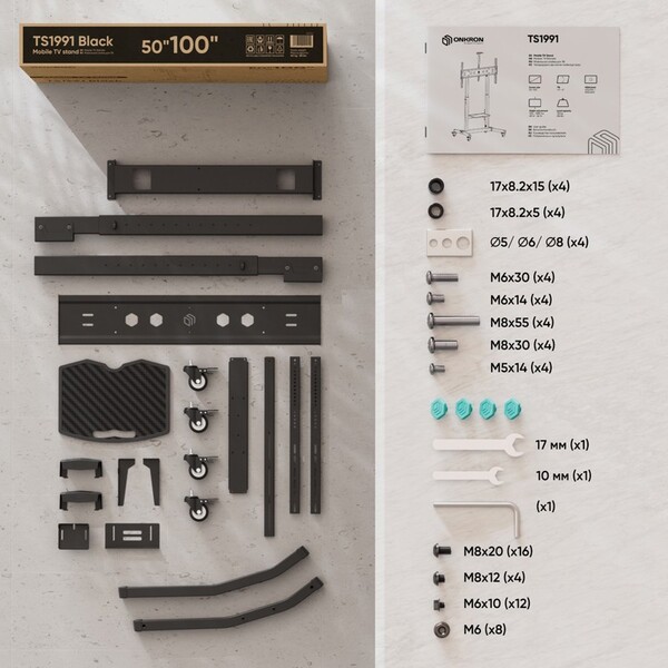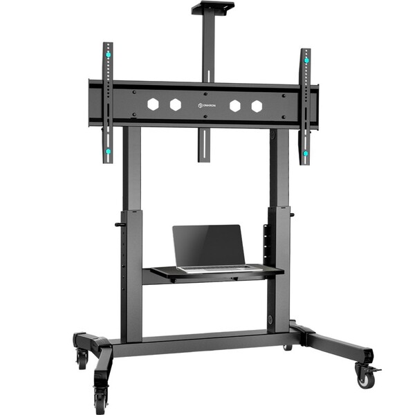 Мобильная стойка ONKRON на 1 ТВ/ 50-100" от 200х200 до 1000х600, макс нагр 120кг, 1 полка для AV, полка для камеры, кабель-канал, высота 1234-1685мм, черный