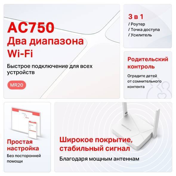Маршрутизатор Роутер беспроводной Mercusys MR20 AC750 10/100BASE-TX купить в интернет-магазине TPShop.Ru. Наличный и безналичный расчет, розничные и оптовые продажи. Самовывоз, доставка по Москве и МО, отправка во все регионы России.