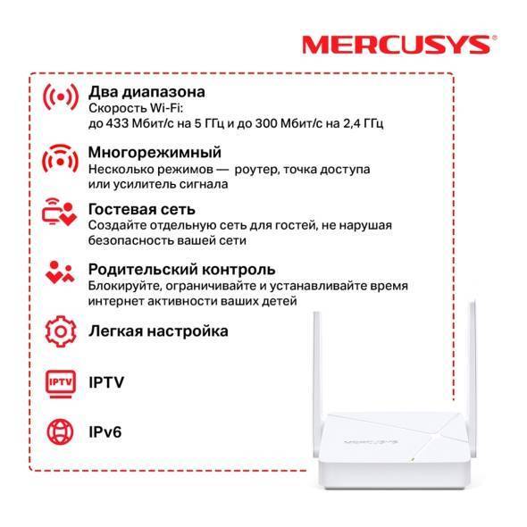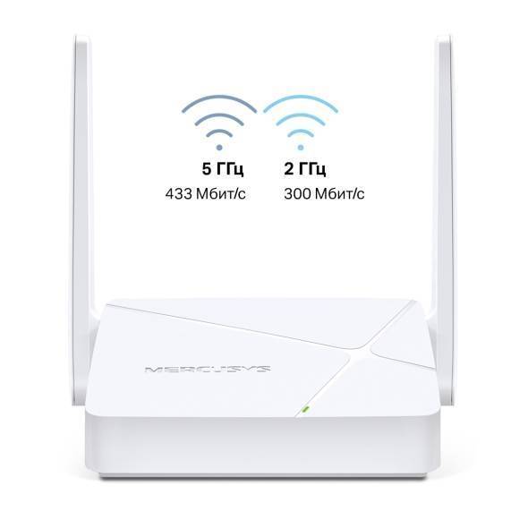 Роутер MERCUSYS AC1200 двухдиапазонный Wi-Fi , до 300 Мбит / с на 2, 4 ГГц + до 867 Мбит / с на 5 ГГц, 4 фиксированные внешние антенны, 3 порта LAN 10 / 100 Мбит / с, 1 порт WAN 10 / 100 Мбит / с