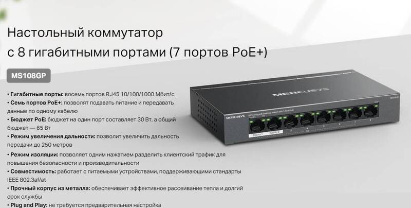 Неуправляемый коммутатор Mercusys MS108GP Настольный коммутатор с 8 гигабитными портами (7 портов PoE+) купить в интернет-магазине TPShop.Ru. Наличный и безналичный расчет, розничные и оптовые продажи. Самовывоз, доставка по Москве и МО, отправка во все регионы России.