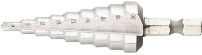 - Сверло ступенчатое по металлу 4-6-8-10-12-14-16-18-20мм, P6M5, шестигранный хвостовик - предназначено для сверления отверстий разных диаметров в материалах из стали, цветных металлов, листовой стали, нержавейки и пластика.