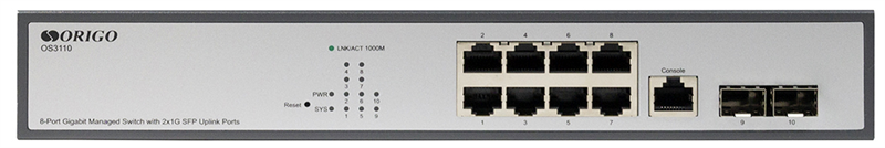- ORIGO Управляемый L2 коммутатор, 8x1000Base-T, 2x1000Base-X SFP, консольный порт RJ-45, комплект для установки в 19" стойку