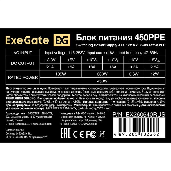Блок питания Exegate EX260640RUS-PC Блок питания 450W Exegate 450PPE, ATX, black, APFC, 12cm, 24p+(4+4)p, PCI-E, 3*IDE, 5*SATA, FDD купить в интернет-магазине TPShop.Ru. Наличный и безналичный расчет, розничные и оптовые продажи. Самовывоз, доставка по Москве и МО, отправка во все регионы России.