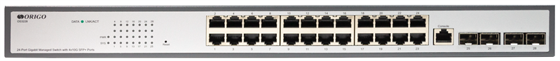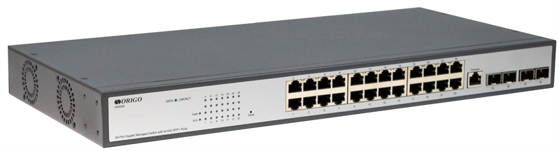 - ORIGO Управляемый L3 коммутатор, 24x1000Base-T, 4x10GBase-X SFP+, консольный порт RJ-45, комплект для установки в 19" стойку