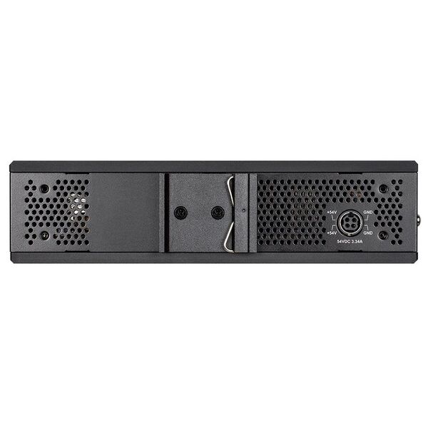 - Консольный порт RJ45. Автоопределение MDI/MDIX на RJ45. Релейный выход для оповещения о сбое питания. Клеммный блок для 2х независимых источников питания (48~54VDC)