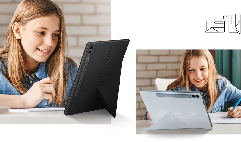 - Защита корпуса и экрана, магнитное крепление, 2 варианта подставки, возможность установки вместе с другими чехлами-накладками на внешний экран, автоматическое включение/выключение экрана, встроенный отсек для электронного пера S Pen.