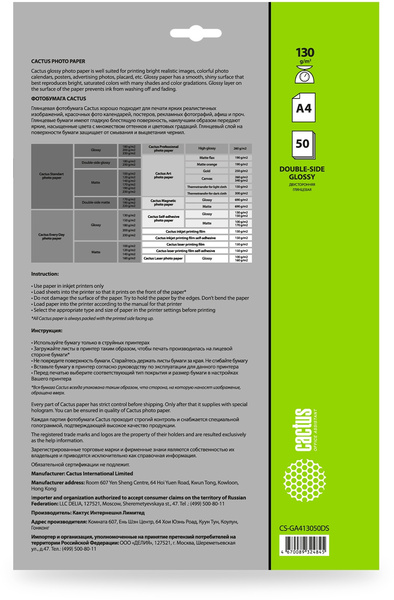 Фотобумага Cactus CS-GA413050DS A4/130г/м2/50л./белый глянцевое/глянцевое для струйной печати купить в интернет-магазине TPShop.Ru. Наличный и безналичный расчет, розничные и оптовые продажи. Самовывоз, доставка по Москве и МО, отправка во все регионы России.