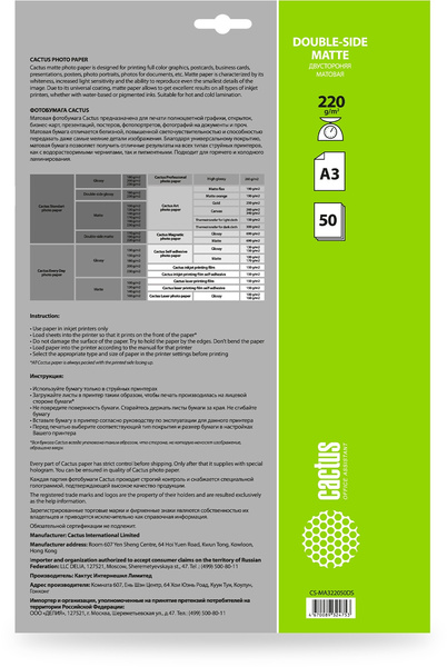 Фотобумага Cactus CS-MA322050DS A3/220г/м2/50л./белый матовое/матовое для струйной печати купить в интернет-магазине TPShop.Ru. Наличный и безналичный расчет, розничные и оптовые продажи. Самовывоз, доставка по Москве и МО, отправка во все регионы России.