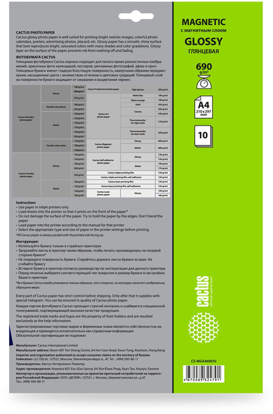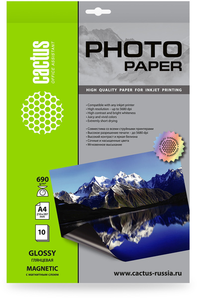 Фотобумага Cactus CS-MGA469010 A4/690г/м2/10л./белый глянцевое/магнитный слой для струйной печати