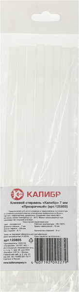 - Клеевой стержень Калибр Прозрачный 7 мм предназначен для использования в термоклеевом пистолете при склеивании широкого спектра упаковочных материалов из бумаги, картона, гофрокартона, древесины. Сохраняет свои свойства в условиях низких температур до - 30°С.