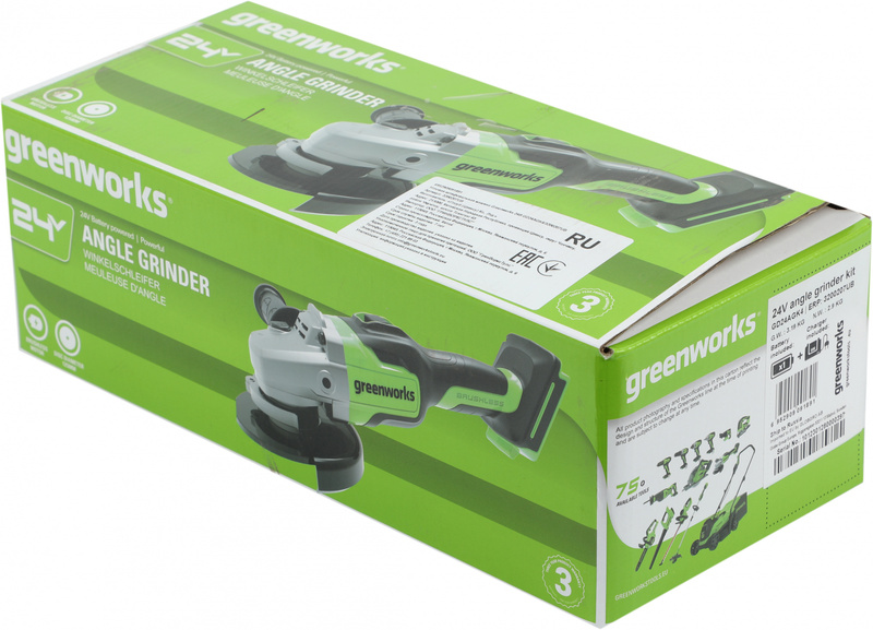 Шлифовальная машина Greenworks GD24AGK4 Угловая шлифовальная машина, аккумуляторная, 24V, бесщеточная, c 1хАКБ 4 Ач и ЗУ в сумке [3200207UB] купить в интернет-магазине TPShop.Ru. Наличный и безналичный расчет, розничные и оптовые продажи. Самовывоз, доставка по Москве и МО, отправка во все регионы России.