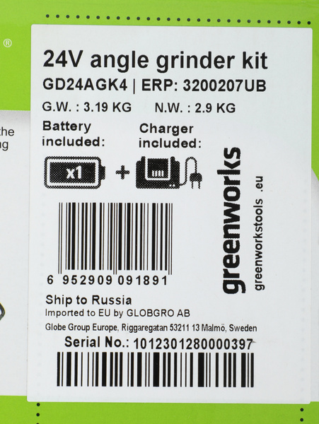 - Угловая шлифовальная машина (болгарка) Greenworks 24V, арт. 3200207; боковая рукоятка; ключ для монтажа диска; аккумулятор Greenworks, 24V, 4 Ач; зарядное устройство Greenworks 24V, 4А; руководство по эксплуатации; гарантийный талон; удобная сумка-переноска.