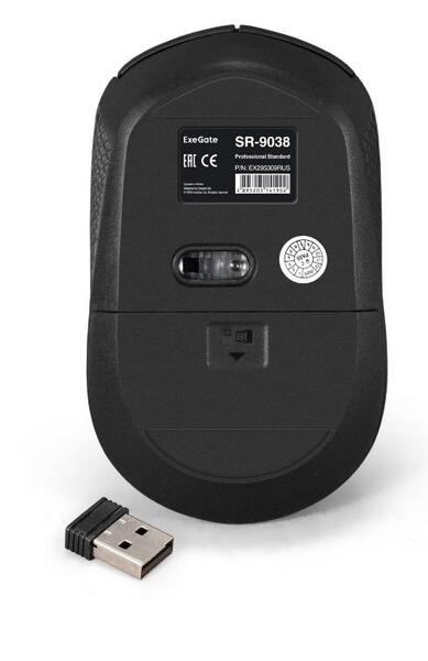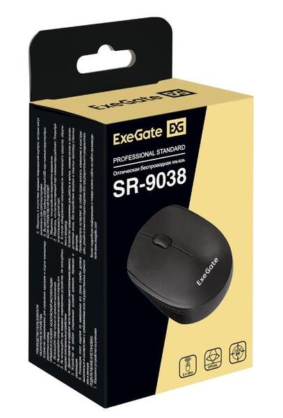 Exegate EX295309RUS Беспроводная мышь ExeGate Professional Standard SR-9038 (радиоканал 2,4 ГГц, USB, оптическая, 1200dpi, 3 кнопки и колесо прокрутки, черная, Color Box)