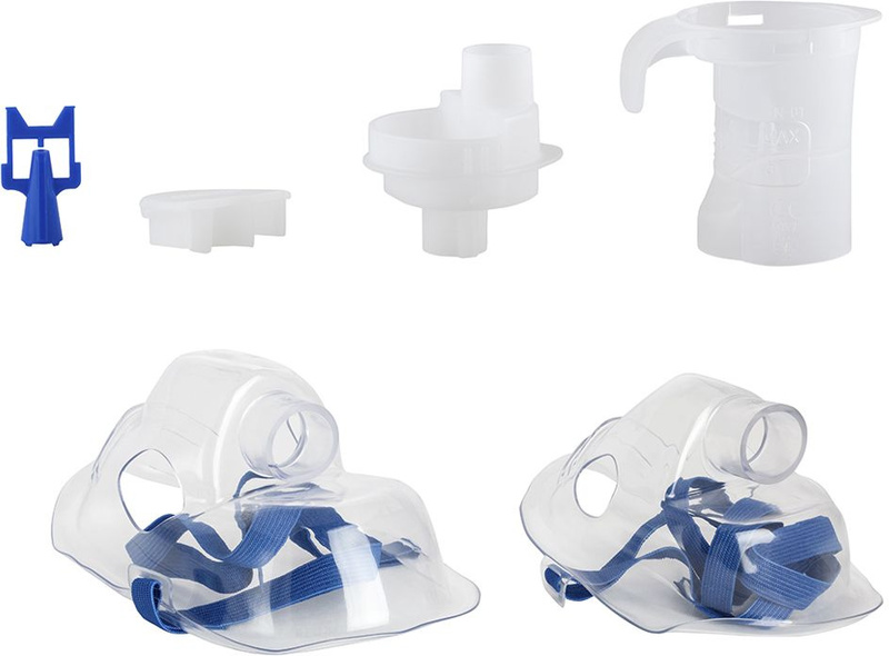- Компрессор небулайзера, воздуховодная трубка (ПВХ, 207 см), загубник, насадка для носа, маска для взрослых (ПВХ), маска для детей (ПВХ), комплект воздушных фильтров, сумка для хранения и переноски