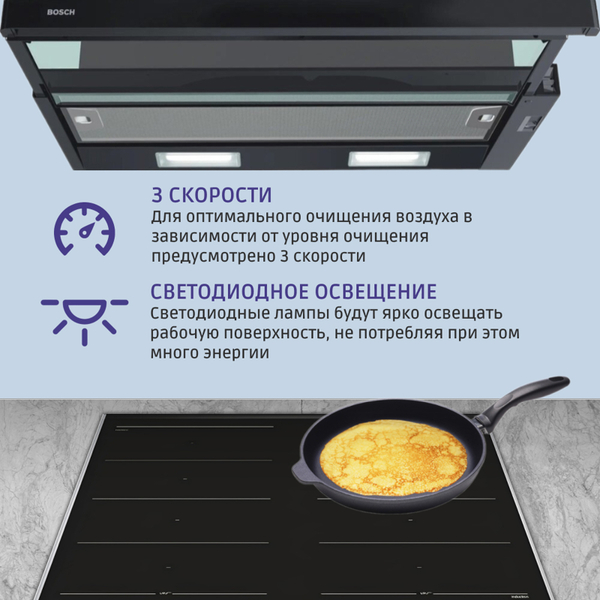 Serie 2, встраивамая вытяжка с выдвижным экраном, 60 см, цвет черный, производительность до 300 м3/ч, режим отвода/циркуляции, 3 ступени мощности, кулисные переключатели, LED-освещение