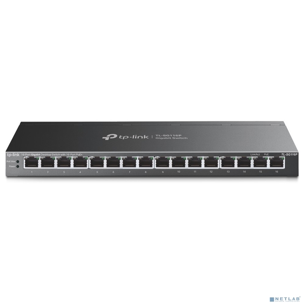 Неуправляемый коммутатор TP-Link TL-SG116P Настольный коммутатор с 16 гигабитными портами PoE+, 16 гигабитных портов PoE+, 802.3af/at, бюджет PoE — 120 В