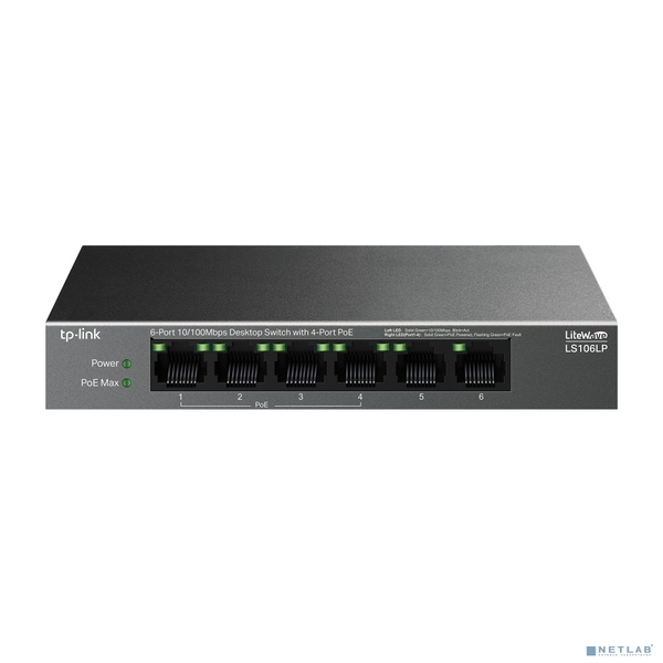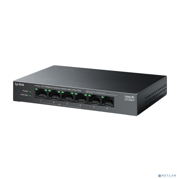 Неуправляемый коммутатор TP-Link LS106LP, Настольный коммутатор с 6 портами 10/100 Мбит/с (4 порта PoE), 802.3af, бюджет PoE — 41 Вт, до 250 метров