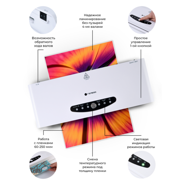 Ламинатор ГЕЛЕОС ЛМ A4-4В, А4, 2х250 (пленка 60-250 мкм), 300 мм / мин, 4 вала, реверс, пластиковый корпус, мах толщина 0.6 мм