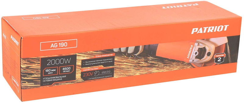 Шлифовальная машина Углошлифовальная машина Patriot AG 190 2000Вт 8500об/мин рез.шпин.:M14 d=180мм (110301180)