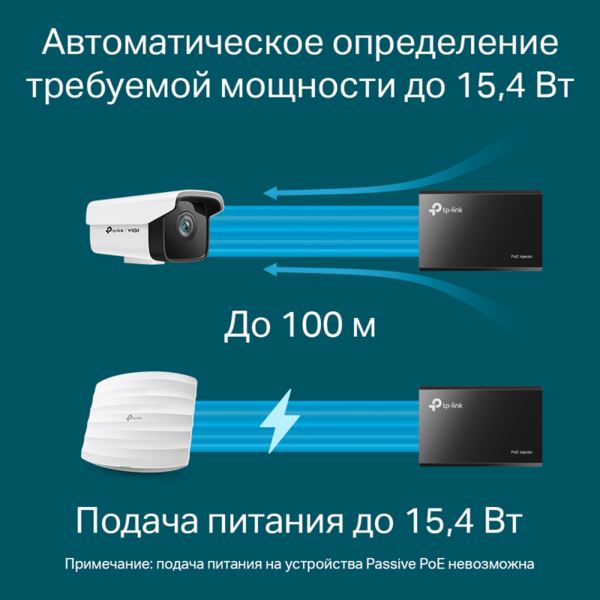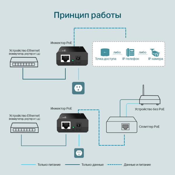 - Инжектор PoE TL-POE150S поддерживает стандарт IEEE 802.3af и может работать со всеми устройствами на базе IEEE 802.3af, питаемыми по PoE, а также сплиттерами (включая TL-POE10R и прочие эквивалентные устройства) с целью развёртывания вашей сети в тех местах, где отсутствуют электрические розетки, и где вам может понадобиться установка таких устройств, как точки доступа, IP-камеры, IP-телефоны и т.д.