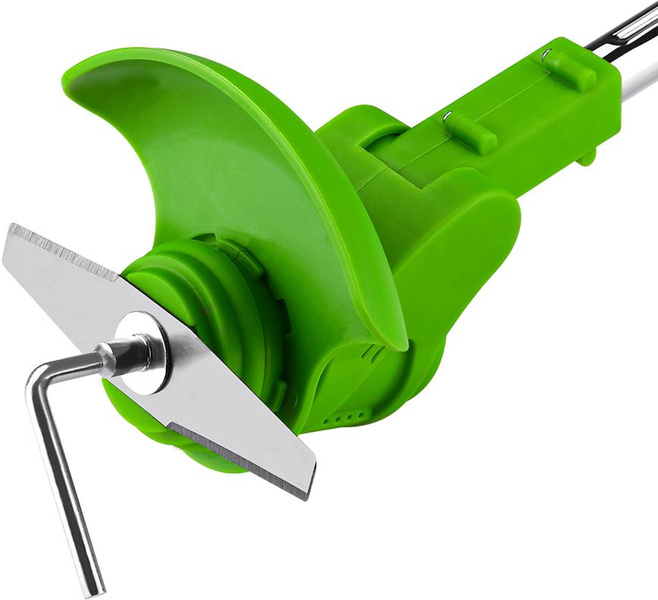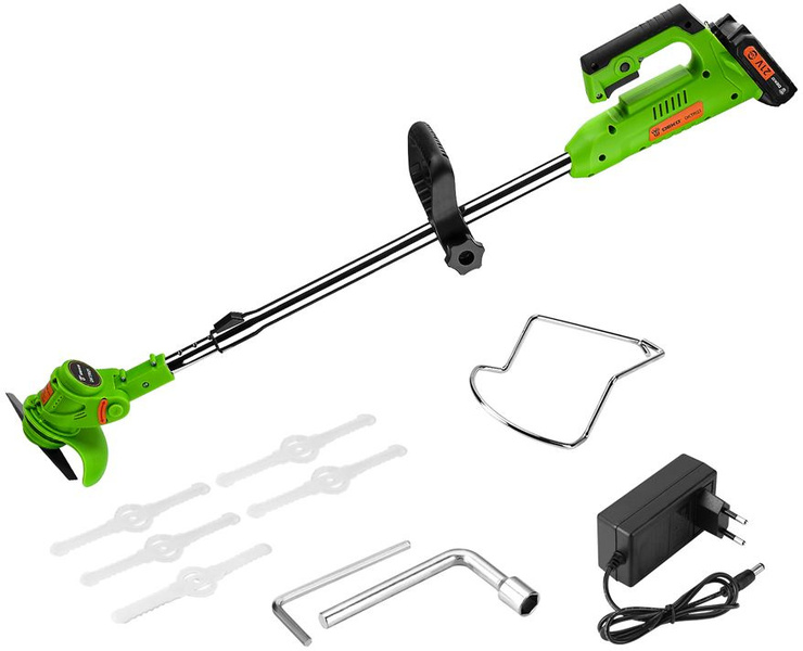 - 1 шт триммер 1 шт аккумулятор 1 шт зарядное устройство 5 шт пластиковые лезвия 1 шт металлическое лезвие 1 шт шестигранный ключ 1 шт торцевой ключ с внутренним шестигранником 1 шт рукоятка 1 шт скоба