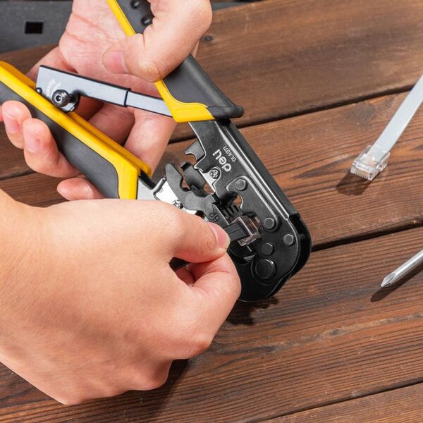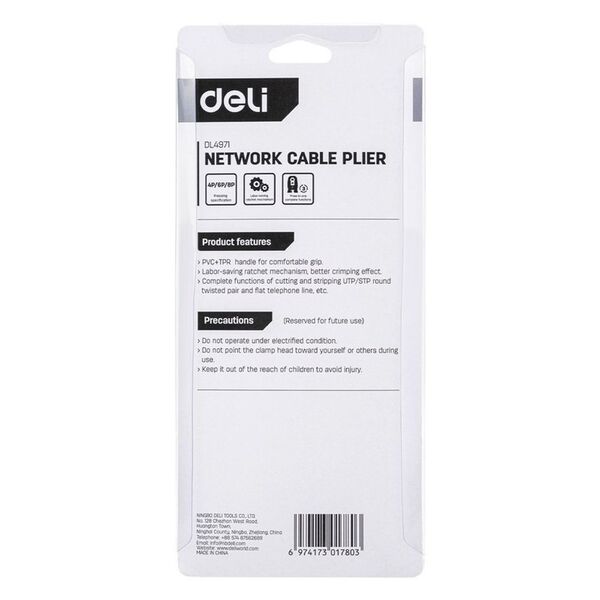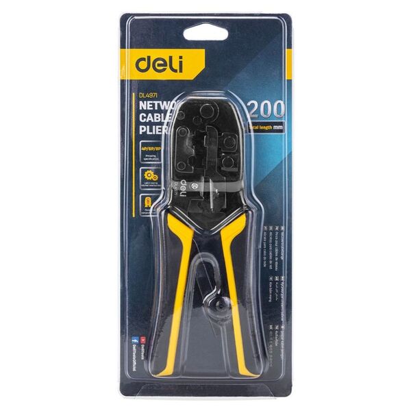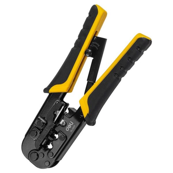 Обжимные клещи Deli DL4971 4P,6P,8P Размер: 200 мм. Спецификация обжима: 4P, 6P, 8P. Сталь A3 с черным покрытием. Ручка из ПВХ и ТПР. Храповой механизм. Подходит для витой пары UTP/STP и телефонных кабелей.