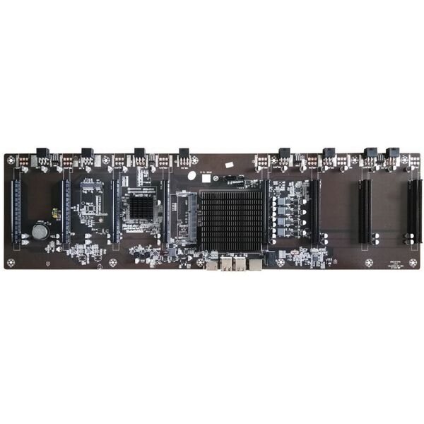 - Распаянный на плате процессор Intel Celeron. Дистанция между слотами расширения - 67мм. 8х разъемов питания (Power-in) 6-pin