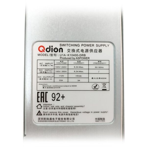 Блок питания Блок питания Qdion U1A-K10400-DRB (FPP-U1A-K10400-DRB) 1U Slim 400W (ШВГ=50.5*40*196mm), 80+ Golg, Oper.temp 0C~50C, AC/DC dual input