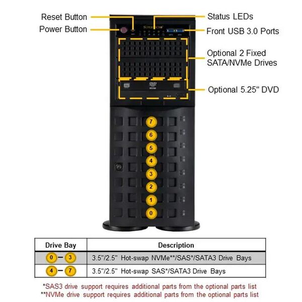 - 4x 3.5" HotSwap NVMe/SAS/SATA + 4x 3.5" HotSwap SAS/SATA (SAS и NVMe - опция) + 2x M.2 NVMe M-Key 2280/22110 + 2x SuperDOM