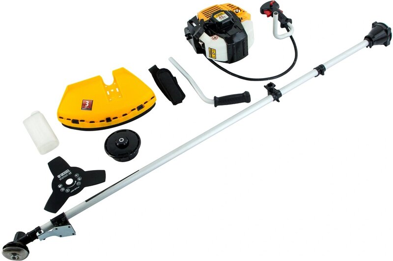 - Триммер бензиновый, катушка, нож трехлопастной 3Т, одноплечевой ремень, дозатор для приготовления смеси, набор крепежа, набор инструментов, руководство по эксплуатации с гарантийным талоном.