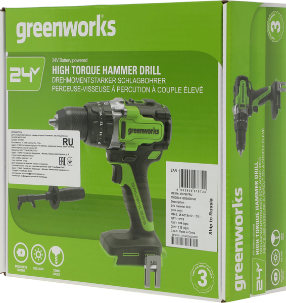 Дрель-шуруповерт аккумуляторная (3707607) GreenWorks GD24DD140, 24V, 140 Нм, бесщеточная, без АКБ и ЗУ