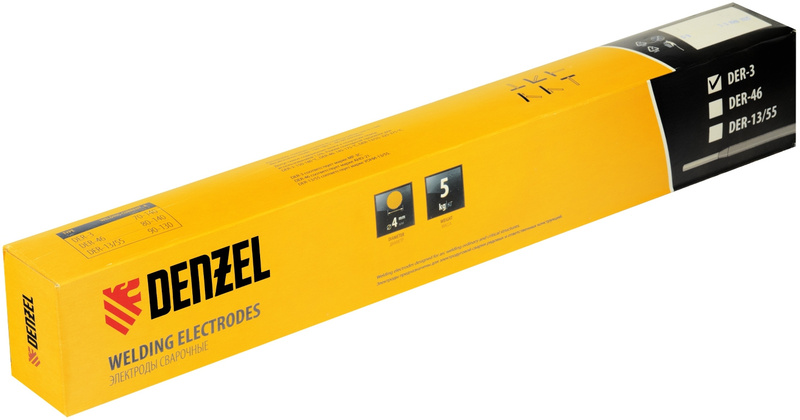 - Электроды Denzel DER-3 97513 диаметром 4 мм., с рутиловым покрытием, 5 кг в упаковке, предназначены для ручной дуговой сварки деталей из углеродистых сталей при максимальном токе 160 А. Подходят для заготовок толщиной 3-5 мм. Электроды пригодятся для сварочных работ в гараже, мастерской или на даче.