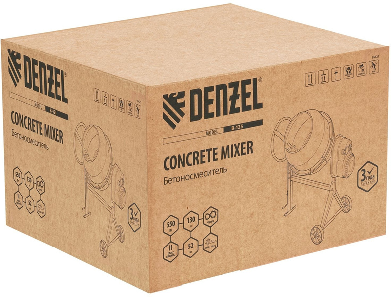 - Бетоносмеситель Denzel B-125 способен работать продолжительное время в режиме высокой нагрузки. Используется в дачном строительстве для приготовления раствора цемента, бетона и других смесей. Легко собирается и прост в обслуживании. Имеет усиленную конструкцию и работает от бытовой сети.