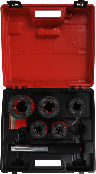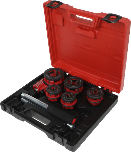 - Трубные клуппы 1/2", 1/4", 3/4", 1", 1 1/4"; Плашкодержатель с трещоткой; Сборная рукоятка.