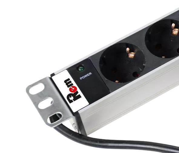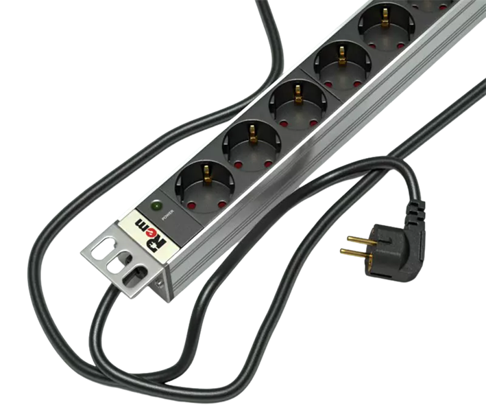 - Блок силовых розеток имеет девять портов стандарта Schuko, выполнен в анодированном алюминиевом корпусе. Розетки расположены под углом 45%, для удобного подсоединения коленчатых штекеров. На лицевой части блока установлен индикатор питания. Кабель питания 3 метра