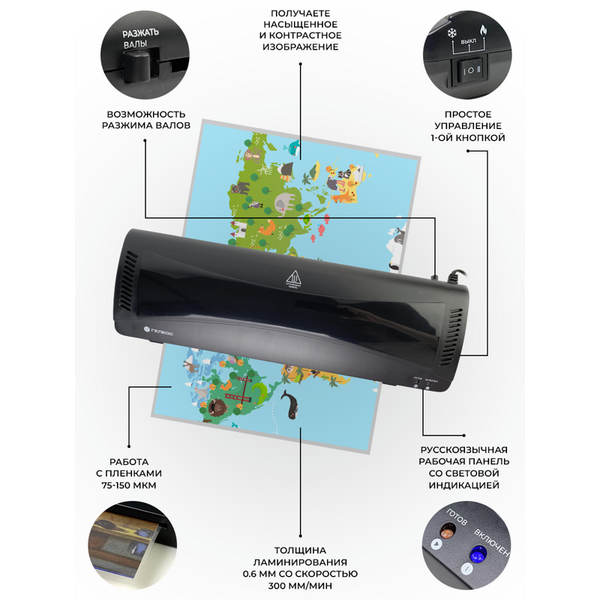 Ламинатор ГЕЛЕОС ЛМ A3 Комбо+, А3, 2х150 (пленка 75-150мкм), 300 мм/мин, 2 вала, пласт. корпус, мах толщина 0,6мм, разжим валов, + резак, обрезчик углов и стартовый набор пленок купить в интернет-магазине TPShop.Ru. Наличный и безналичный расчет, розничные и оптовые продажи. Самовывоз, доставка по Москве и МО, отправка во все регионы России.
