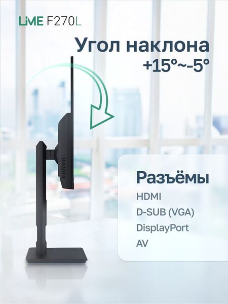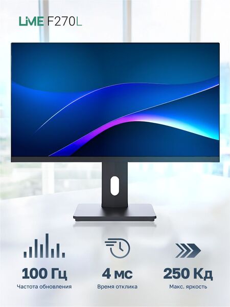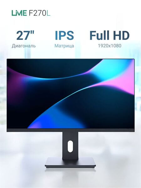 Монитор Монитор Lime 27" F270L Black (IPS, 1920x1080, VGA+HDMI+DP+USB In/2xOut+Audio out +DC, 4 ms, 178°/178°, 250 cd/m, 1000:1, 100Hz, Pivot, Flat, внутр. БП)