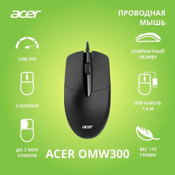 Мышь Acer OMW300 черный оптическая (1200dpi) USB (3but) купить в интернет-магазине TPShop.Ru. Наличный и безналичный расчет, розничные и оптовые продажи. Самовывоз, доставка по Москве и МО, отправка во все регионы России.
