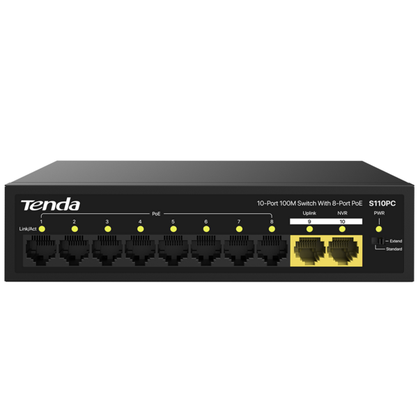 Неуправляемый коммутатор Tenda S110PC Коммутатор неуправляемый PoE, 10 портов, 10x100 Мбит/с, PoE 8х до 30 Вт, настольный
