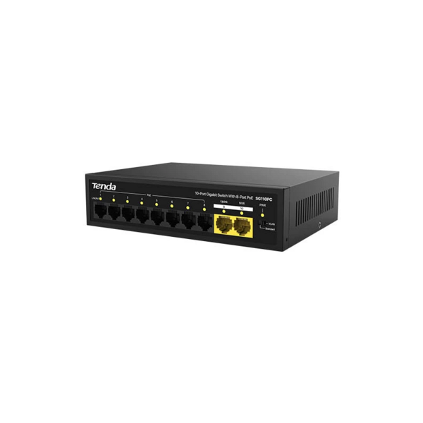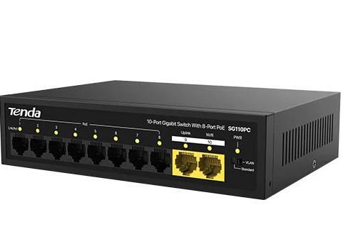 Неуправляемый коммутатор Tenda SG110PC Коммутатор неуправляемый PoE, 10 портов, 10x1 Гбит/с, PoE 8х30 Вт, 2хUplink, настольный