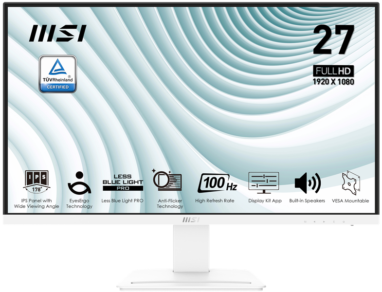 - MSI PRO MP273AW 27" 16:9 FHD(1920x1080)IPS Flat,5ms(GTG),1000:1,100M:1,300nit,178/178,1xHDMI ,1xDP, 1*D-Sub (VGA) ,Tilt,VESA,100Hz,1y w-ty, White